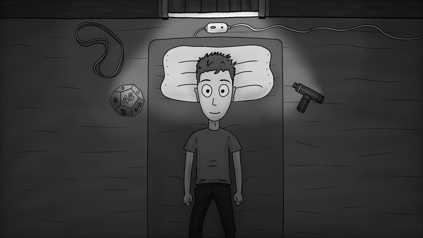 In the corner of the room is a wellness area: a massage gun, a vibrating faceless timer, a yellow resistance band, a heating pad, and a neck roller called a denneroll â a horribly named device invented in the early 2000s by a chiropractor named Dr. Adrian Dennewald who Ben says is not a real doctor, but then I remind Ben that Dr. Dennewald has invented a device used by millions and what has Ben done besides overslept.