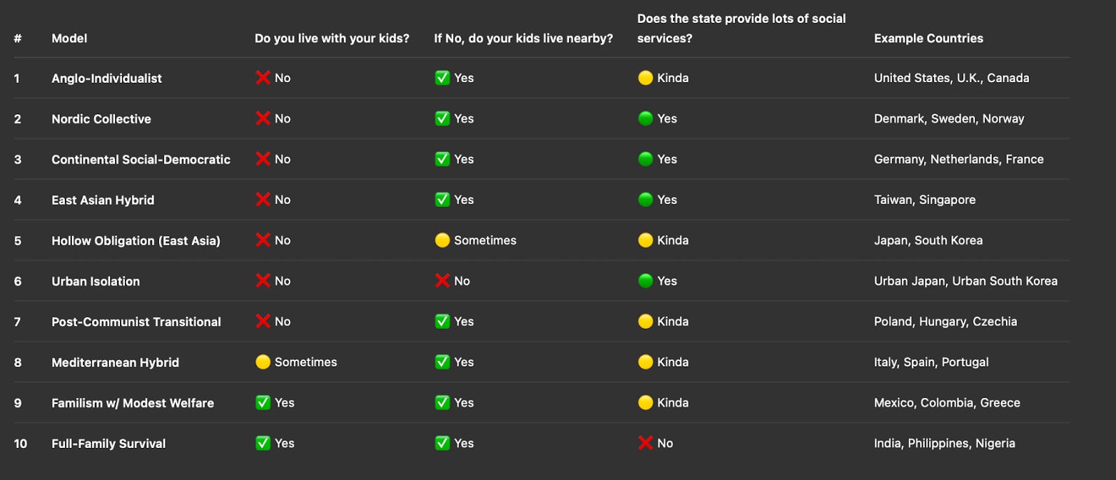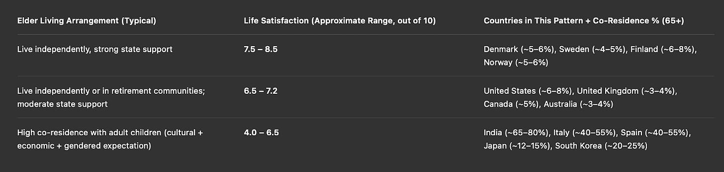 The data comes from OECD reports, the World Happiness Report, UN datasets, a few country-specific aging studies, and some GPT inference, which means it’s far from perfect. But the point isn’t that people magically become happier when old people stop living with their kids; it’s that the countries where people are happy and wealthy also happen to be the places where old people choose not to live with their kids.