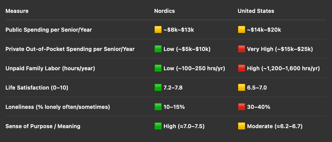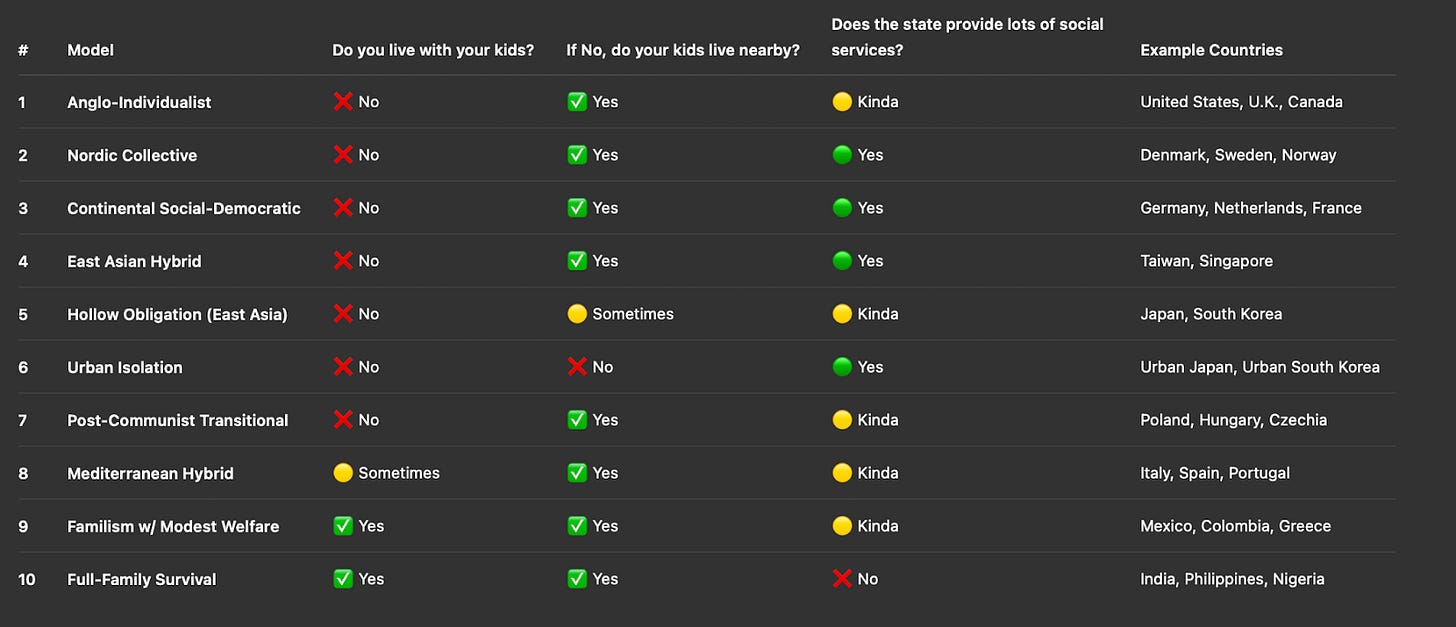 The American model looks like No/Yes/Kinda, where most old people live in a prison with other old people, 80% of American elders are within 100 miles of their kids, and the state provides minimal Medicare w/Assisted Living Waiver programs.