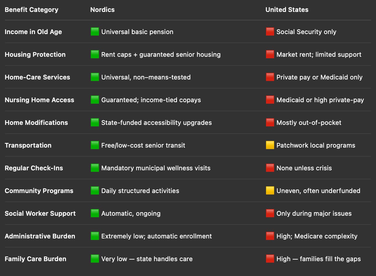The Nords have a model that I think most Americans would hate, but basically, once you reach a certain age, you get universal basic income + social services that everyone has to accept wherein, every six months or so, a social worker shows up to your house to enroll you in mandatory benefits like home cleaning, bathing, grocery, meal prep, and transportation to social events and all of this is not optional because by making the assistance mandatory, it removes the shame around feeling incapable or poor while helping solve the ultimate goal of keeping elder happiness high while preventing the state from paying for expensive crisis hospitalizations.